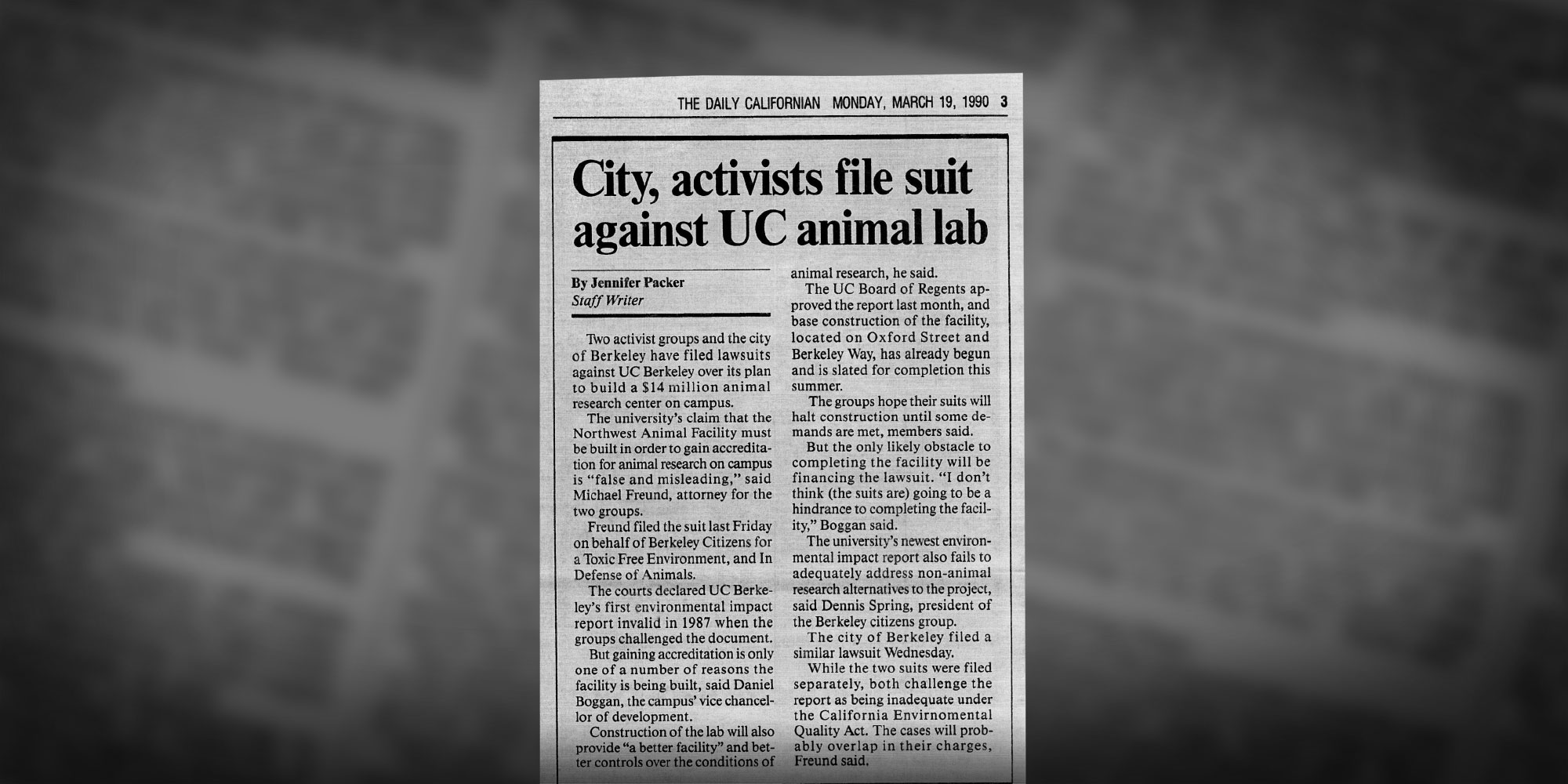 1990 – A lawsuit was filed on behalf of several groups, including Berkeley Citizens for a Toxic Free Environment challenging the University of California's plans to construct an animal research facility. This case settled for environmental remediation measures.